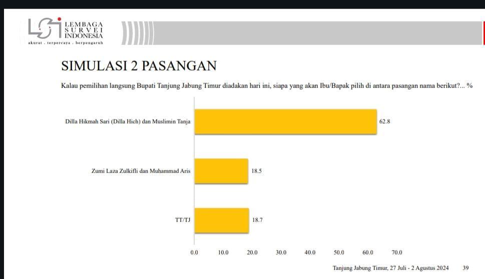 Peta kekuatan itu terpotret jelas dari sejumlah survey elektoral yang dilakukan berbagai lembaga survey kredibel. Terakhir survey Lembaga Survey Indonesia (LSI) yang memposisikan Dilla – MT di angka 62,8 persen jauh meninggalkan lawannya Zumi Laza – Muhammad Aries yang hanya 18,5 persen.(*)